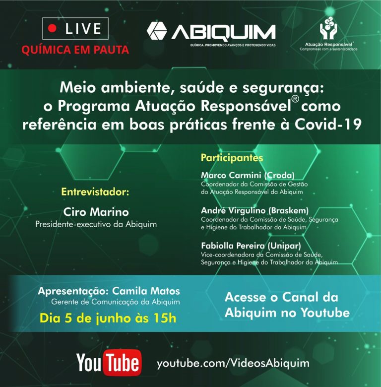 A Associação Brasileira da Indústria Química (Abiquim) promove live com tema “Meio ambiente, saúde e segurança: o Programa de Atuação Responsável como referência em boas práticas frente à Covid-19”.