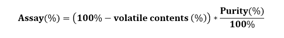 Os valores dos ensaios para padrões de referência da Mikromol são obtidos por meio da cromatografia líquida de alta performance com matriz de fotodíodos (HPLC-PDA) ou outra técnica cromatográfica, além de conteúdo volátil (água e solvente residual). Para calcular o valor do ensaio (procedimento conhecido como o método 100%), utiliza-se a equação a seguir: