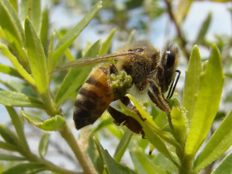Imagem – Abelha operária (Apis mellifera) coletando resina de alecrim-do-campo (Baccharis dracunculifolia) que, ao entrar em contato com enzimas de sua saliva, torna-se própolis verde – Foto: Michel Stórquio Belmiro/Wikimedia Commons