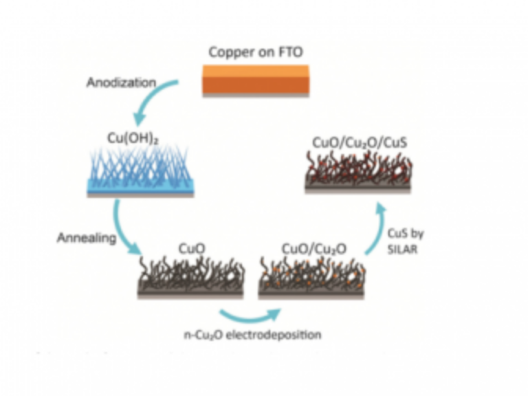 Os pesquisadores do CDMF utilizaram nanoestruturas de cobre como óxido cúprico do tipo p (p-CuO) combinadas com óxido cuproso do tipo n (n-Cu2O) e monossulfeto de cobre (CuS) como fotocátodos para a reação de separação da água em oxigênio e hidrogênio.
