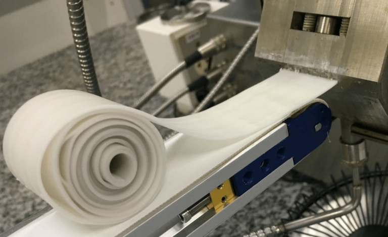 Carmen Tadini explica que o laboratório conta com uma extrusora de rosca dupla, equipamento usado para testar novos materiais e que também permite a produção contínua em larga escala. A máquina foi adquirida por meio do programa Equipamentos Multiusuários (EMU) da FAPESP, o que permite a pesquisadores de outras universidades ou empresários usá-la, seguindo o modelo de uma facility.