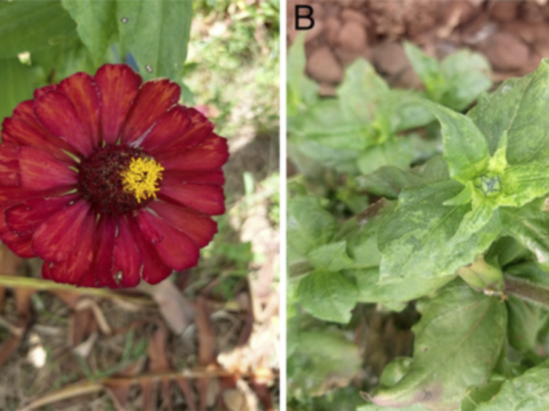 Plantas de zínia (fotos A e B) infectados pelo bidens mottle vírus (BiMoV-BR), apresentando sintomas de mosaico, deformação foliar e variegação floral; exemplares de picão-preto (fotos C e D) infectadas pelo vírus e com apresentando sintomas de mosqueamento foliar – Imagens: Reprodução do artigo