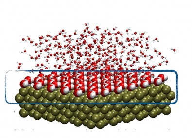 A molécula de água (H2O) é coplanar – os centros do átomo de oxigênio e dos dois átomos de hidrogênio localizam-se no mesmo plano. E, nesse plano, os centros posicionam-se na forma de um V, com o oxigênio no vértice e os hidrogênios nas duas pontas, formando um ângulo de aproximadamente 104,5 graus entre si. Dependendo do metal e da geometria da superfície metálica, isto é, das coordenadas do plano de clivagem, as moléculas da primeira camada de água podem ficar paralelas à superfície ou girar, de modo que os hidrogênios se aproximem ou se afastem da superfície. Essas diferentes configurações influenciam fortemente a reação.
