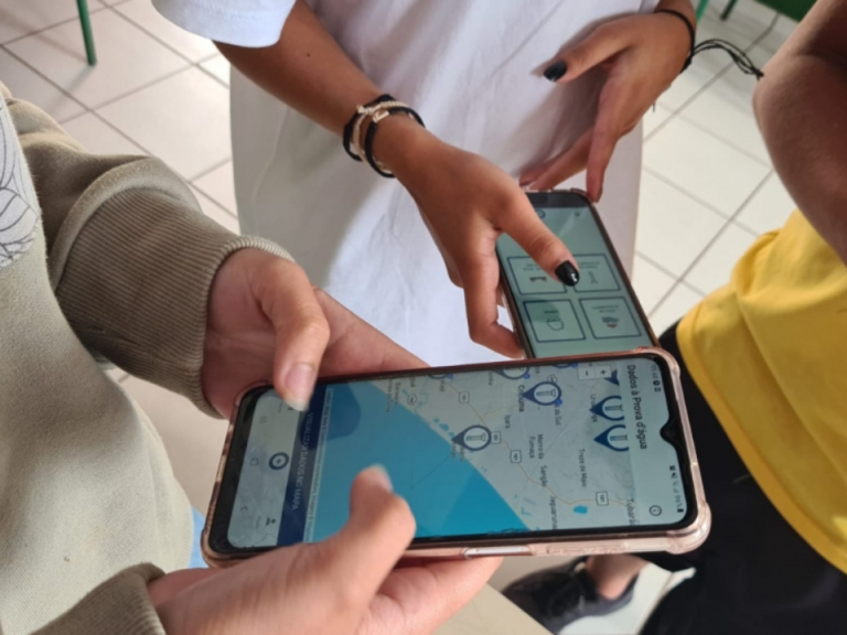 Imagem – Alunos em Balneário Rincão (SC) manipulam aplicativo Dados à Prova D’Água; envolvimento de comunidades no desenvolvimento ajudou mapeamento de áreas suscetíveis a enchentes (foto: Rosinei da Silveira)