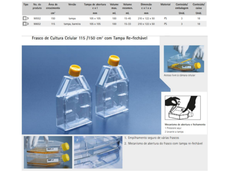 O frasco 90552 para cultivo celular e de tecidos, é estéril, tampa com filtro refechável, superfície tratada e área de crescimento de 115 ou 150 cm², eles