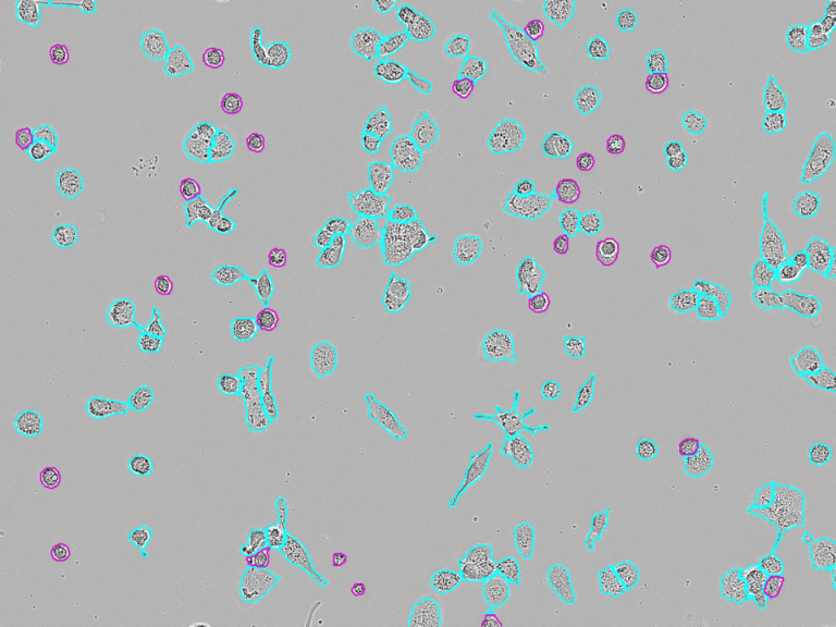 - Uma comparação da quantificação validada do ensaio Vivo/Morto, de seis linhas celulares diferentes, utilizando classificação avançada label free, versus um reagente fluorescente padrão de anexina V.